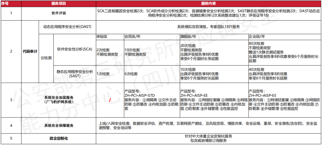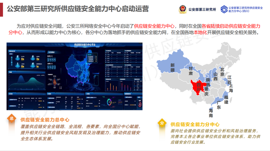 经能力中心授权,已成立公安部第三研究所供应链安全能力分中心(四川)(简称“四川能力分中心”)。四川能力分中心将面向社会提供产品供应链安全技术分析和风险治理服务,出具由供应链安全能力中心认证的技术分析报告。以供应链的“安全服务、分析评估、威胁情报、人员培训”四大板块组成,四川能力分中心是四川省唯一一家软件供应链安全测试中心,也将成为国家软件供应链安全能力体系建设的核心主体之一。