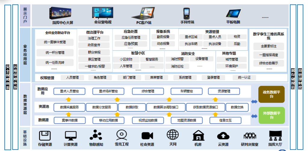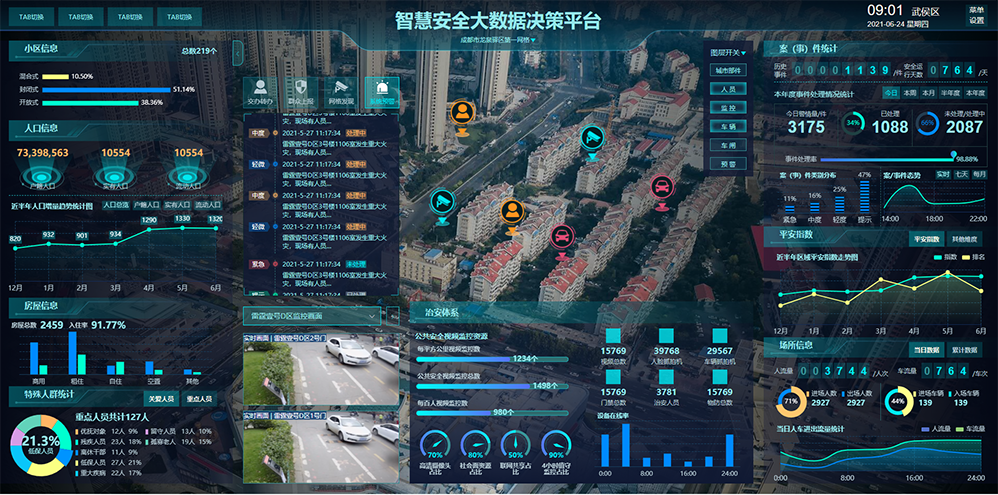 • 大数据汇聚:人、房、地、事、物数据汇聚分析;城市治理全要素;过人、过车全记录