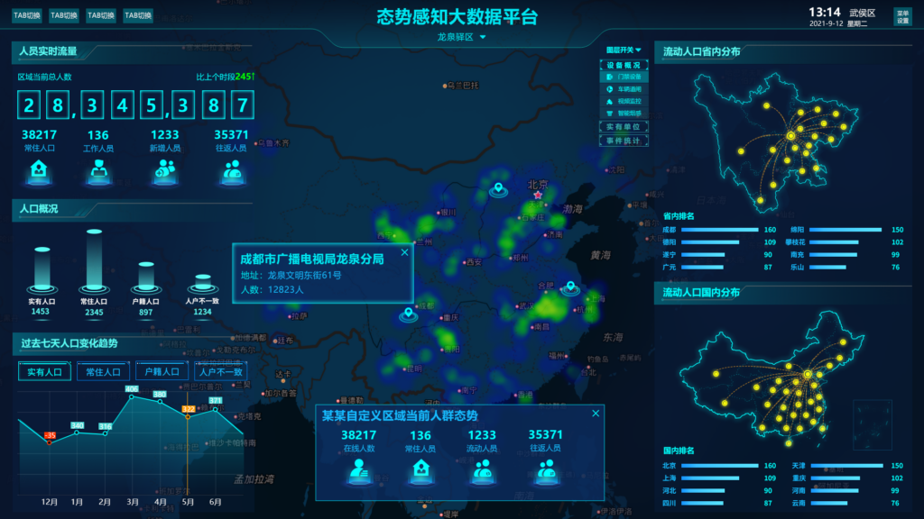 将洛带镇“大联动,微治理”平台、雪亮工程、社会治安立体化防控信息平台、景区消防管理系统、景区用电管理系统、热成像温度与烟雾识别系统、景区客流量监测系统等平台有机融合,整合社会面视频资源和智慧小区信息系统,构建基层社会治理的全要素大数据平台。